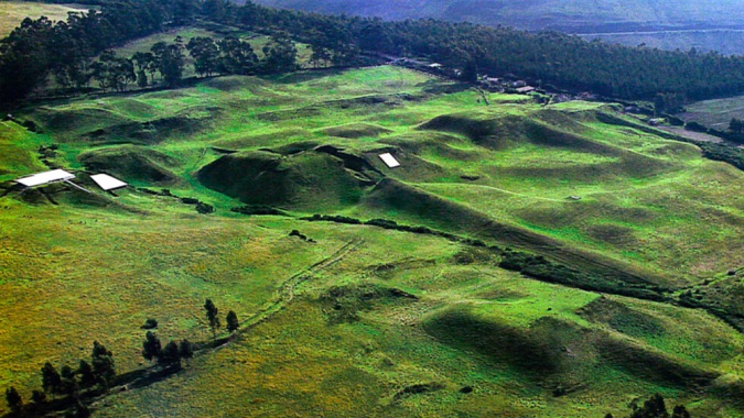 El parque alberga 15 pirámides truncas y 21 montículos funerarios construidos entre los años 500 y 1500 d.C. por la civilización Quitu-Cara. Estas estructuras hechas de cangahua revelan avanzadas técnicas de construcción prehispánica.
